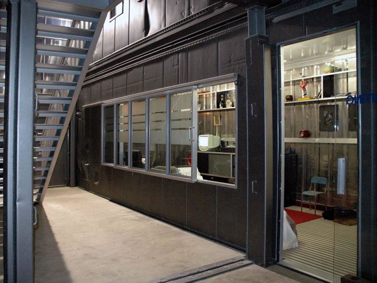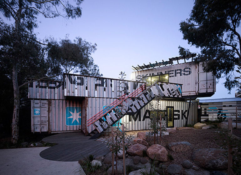This shipping container project has reused every element of the container to create stairs, awnings and balustrades. It also makes good use of the branding on the original containers. Pretty creative!