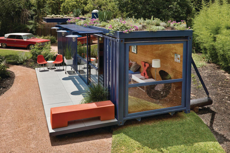 The slanted roof on this shipping container home lets sun and breezes into the house.