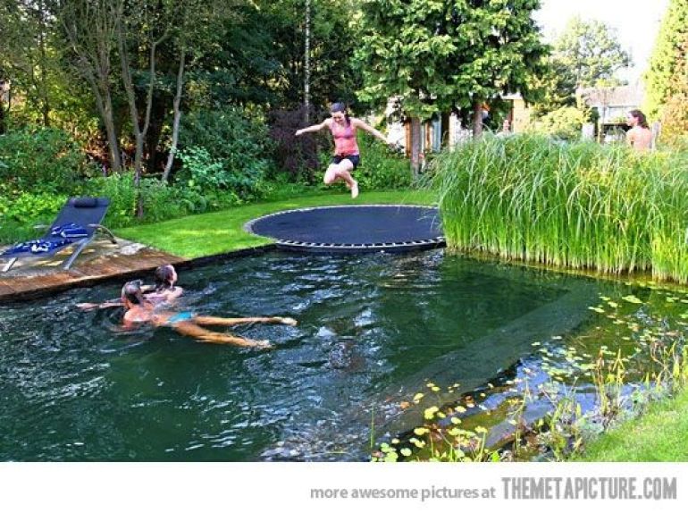 Not only is this a natural pool, cleaned by the reeds and plants on the side there, it's also a super fun trampoline pool. Falling of the trampoline never looked so fun! The bonus: no more stingy eyes or green hair after a day in a chlorine-filled chemical bath.