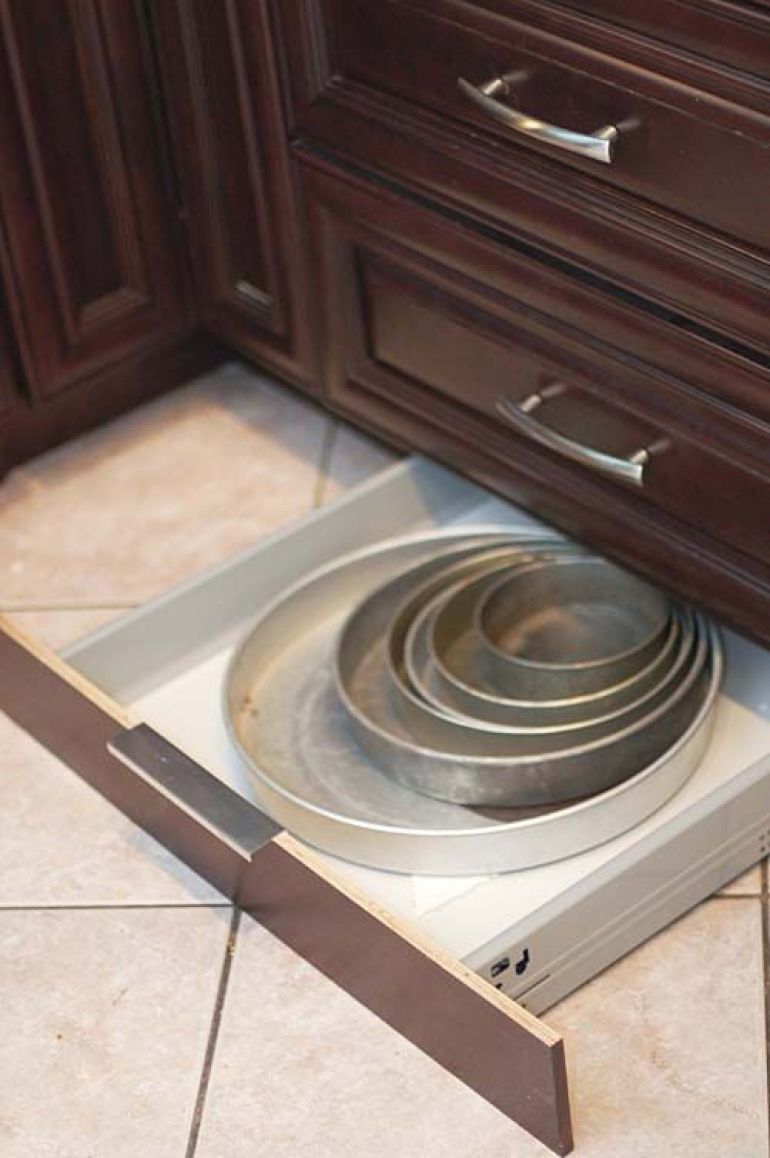 Those cumbersome baking trays and cake tins you end up storing in the oven? Have a secret hiding place built into your new kitchen -- right in the kick board! Perfect for those long, flat containers.