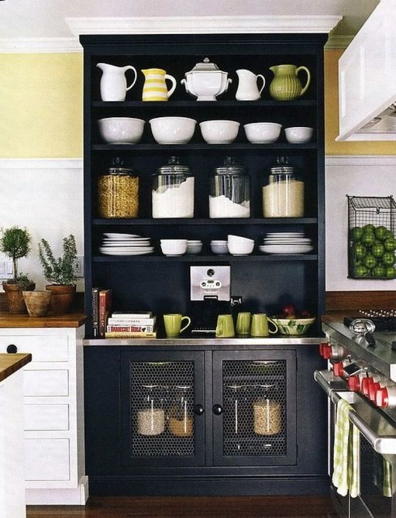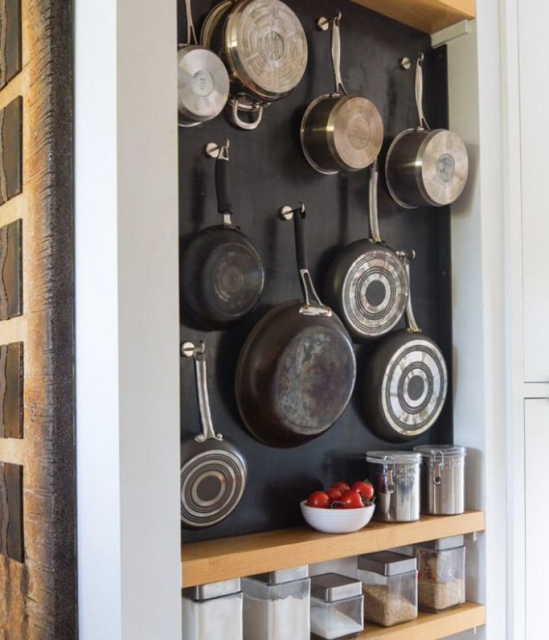 But on the subject of 'less eye-pleasing', even pots and pans can look incredible with the right presentation. The dark background of this storage nook makes the pots and pans look like an art-piece. We also approve of the flour and cereal display.