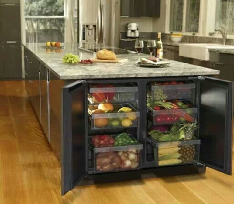 What an incredible idea - integrate bar fridges into the side of your breakfast bar. It looks good and healthy filled with fruit and vegetables, but what really gets us excited is the idea of filling them with beer and wine!