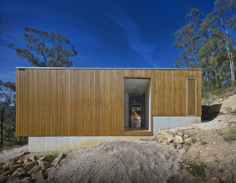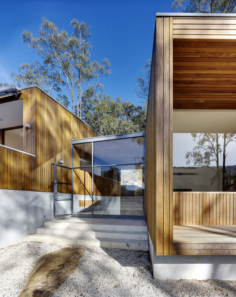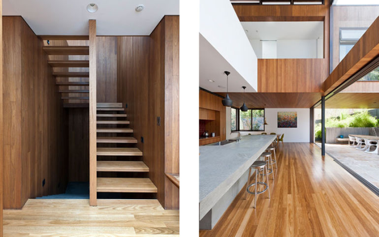 Two separate pavilions are sited in the landscape and oriented to embrace their relative surrounds. The use of locally sourced hardwood cladding and raw concrete help the house to sit comfortably in its place.