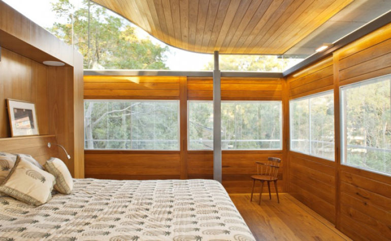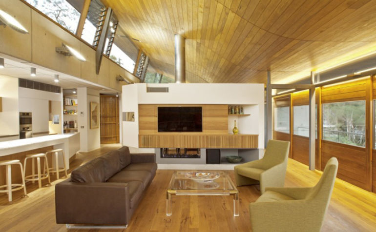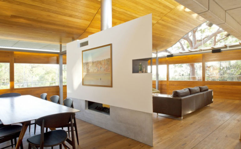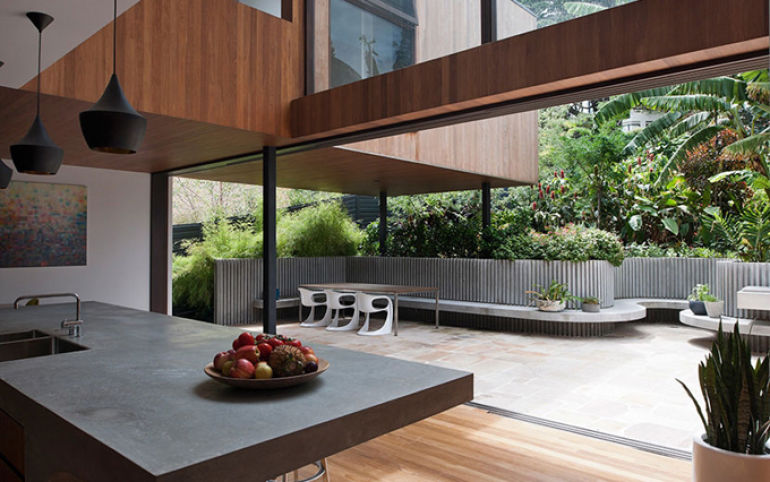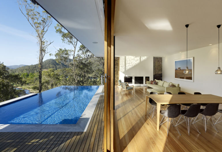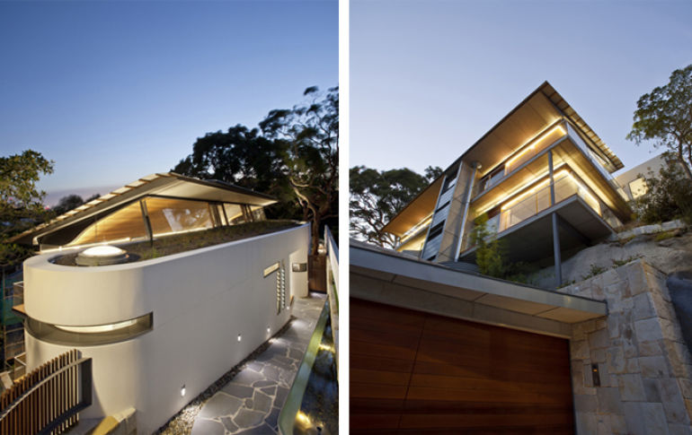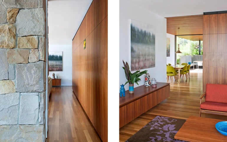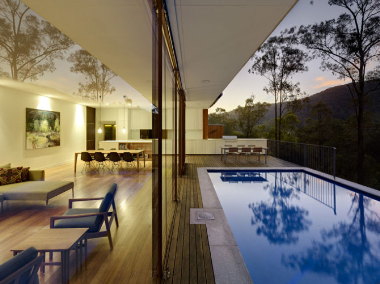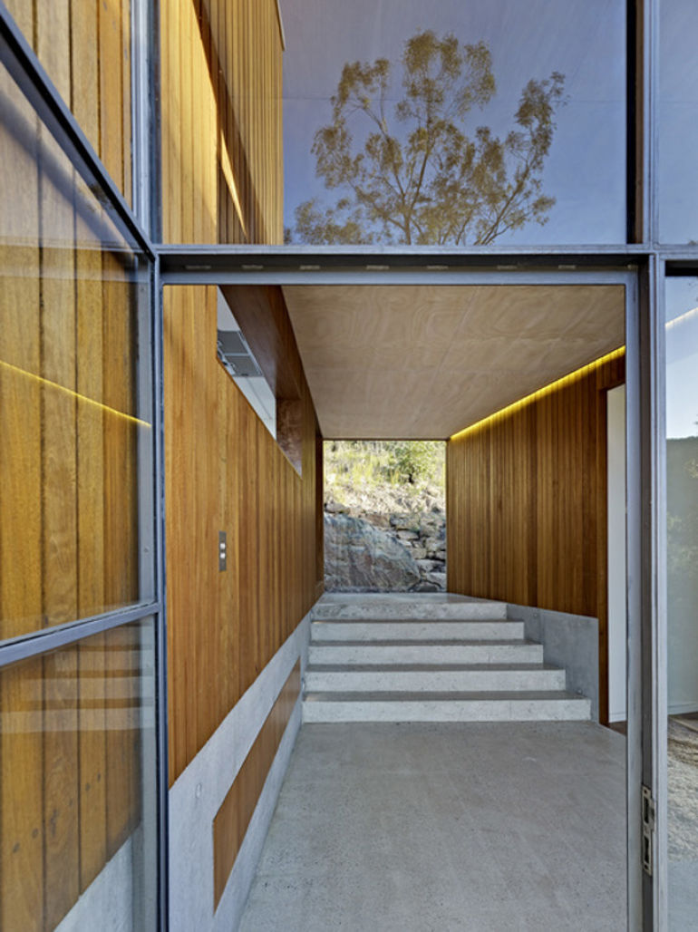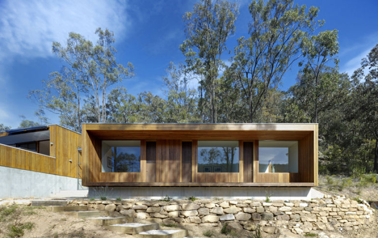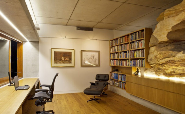 Taking control of a difficult side built over an escarpment, the Angophora House has three distinct elements: cave, platform and canopy. The stone escarpment is left exposed in the lower rooms - if you've ever wanted a Bruce Wayne-style bat cave, this house is for you!