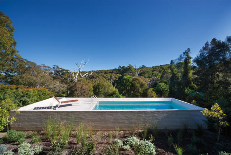 An idyllic 'swimming island' is separated from the house by native shrubbery.