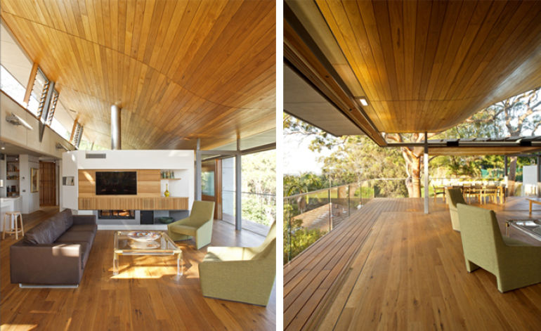 Internal timber lining combines with the sinuous roof adds a warm, organic feel to the space.