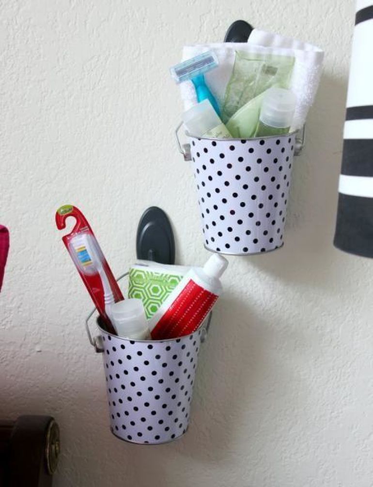 Install some tin buckets on your bathroom wall. You can design them to your taste -- polka dots, stripes or plain. They’re perfect tools to hold your brushes, toothpastes, shaves and other trinkets.