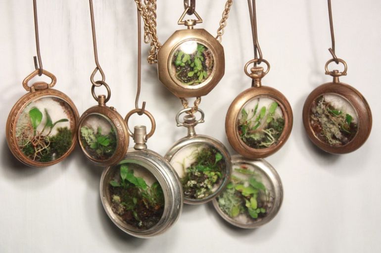 One of the more creative terrariums are these adorable necklaces made from old pocket watches.
