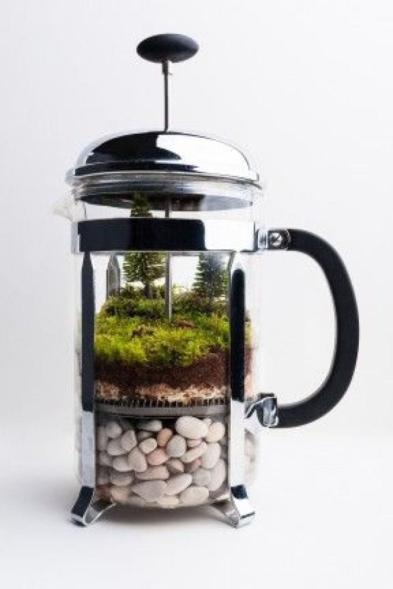 What a clever idea! An old coffee press it the perfect vessel for a mini terrarium.