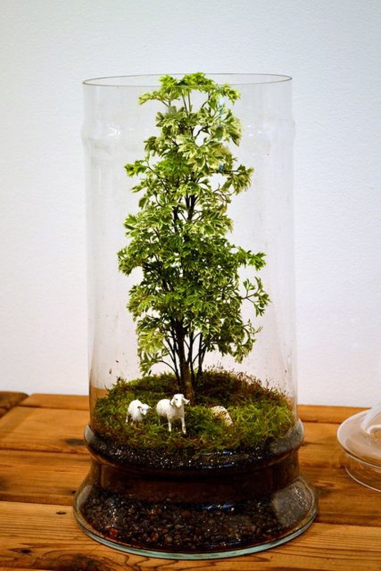 This terrarium has it all -- a bonsai, lush green moss and an adorable sheep to make it farmyard themed. Very cute.