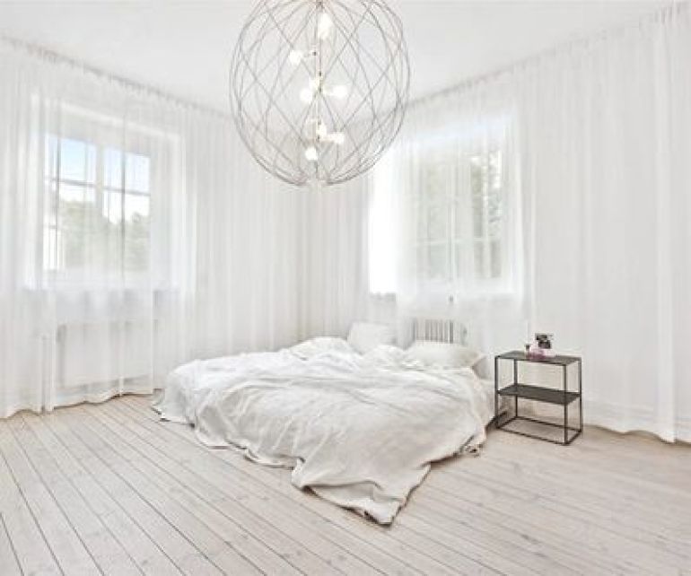 Texture from the bed spread, shear curtains and lime washed timber combine with a statement lamp. A splash of 'colour' balances out what would otherwise be a very stark white room.