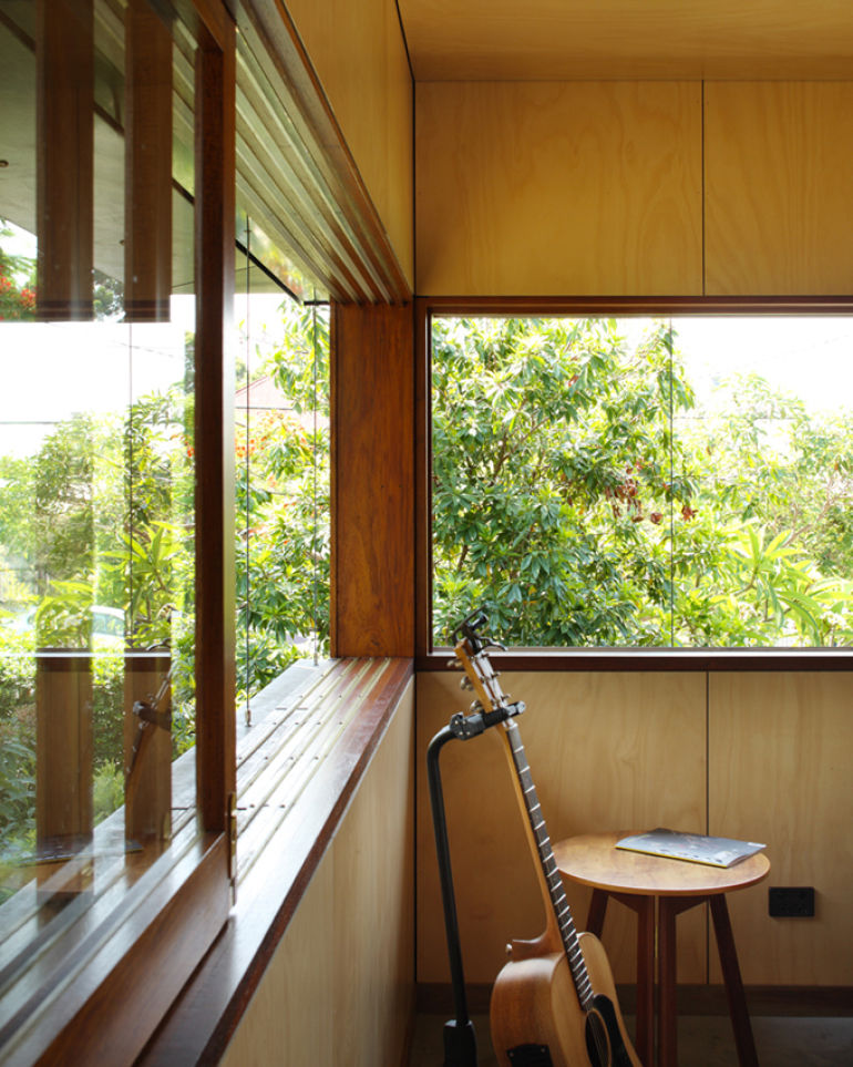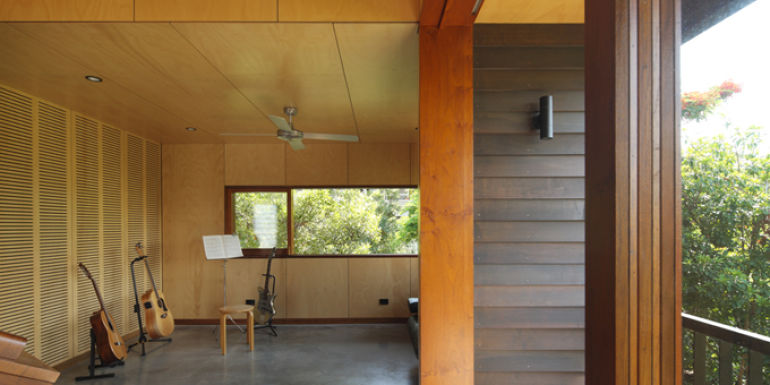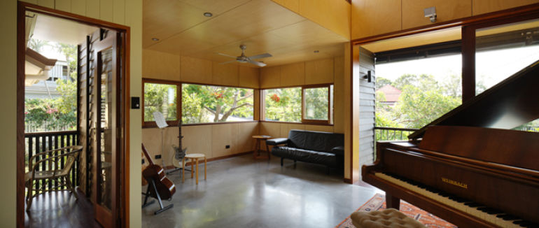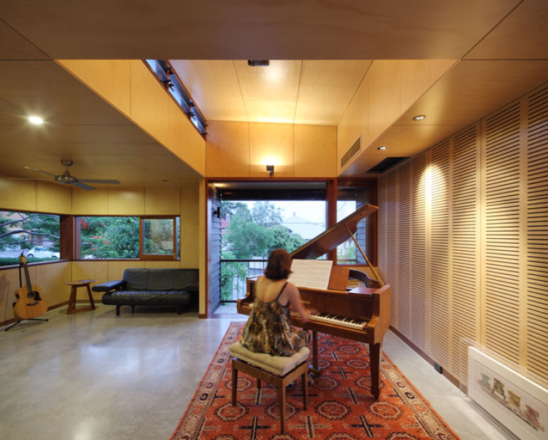 If you've ever wanted to work in a treehouse, then the New Farm Studio is the type of workspace you should be looking to build for yourself! Adapting to the traditional Elevated Queenslander behind, the Studio embraces its height, flaunting its tree-top position. Wide awnings over the windows add flair and protect from the harsh Queensland sun, while the light timber clad box can be opened up and ventilated to take advantage of tropical breezes. I'm sure you'll agree, it would be a pretty cool place to enjoy the sounds of that incredible piano!