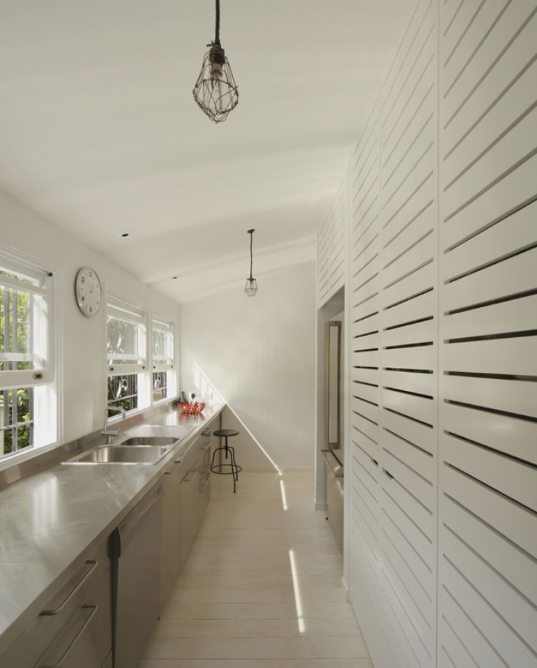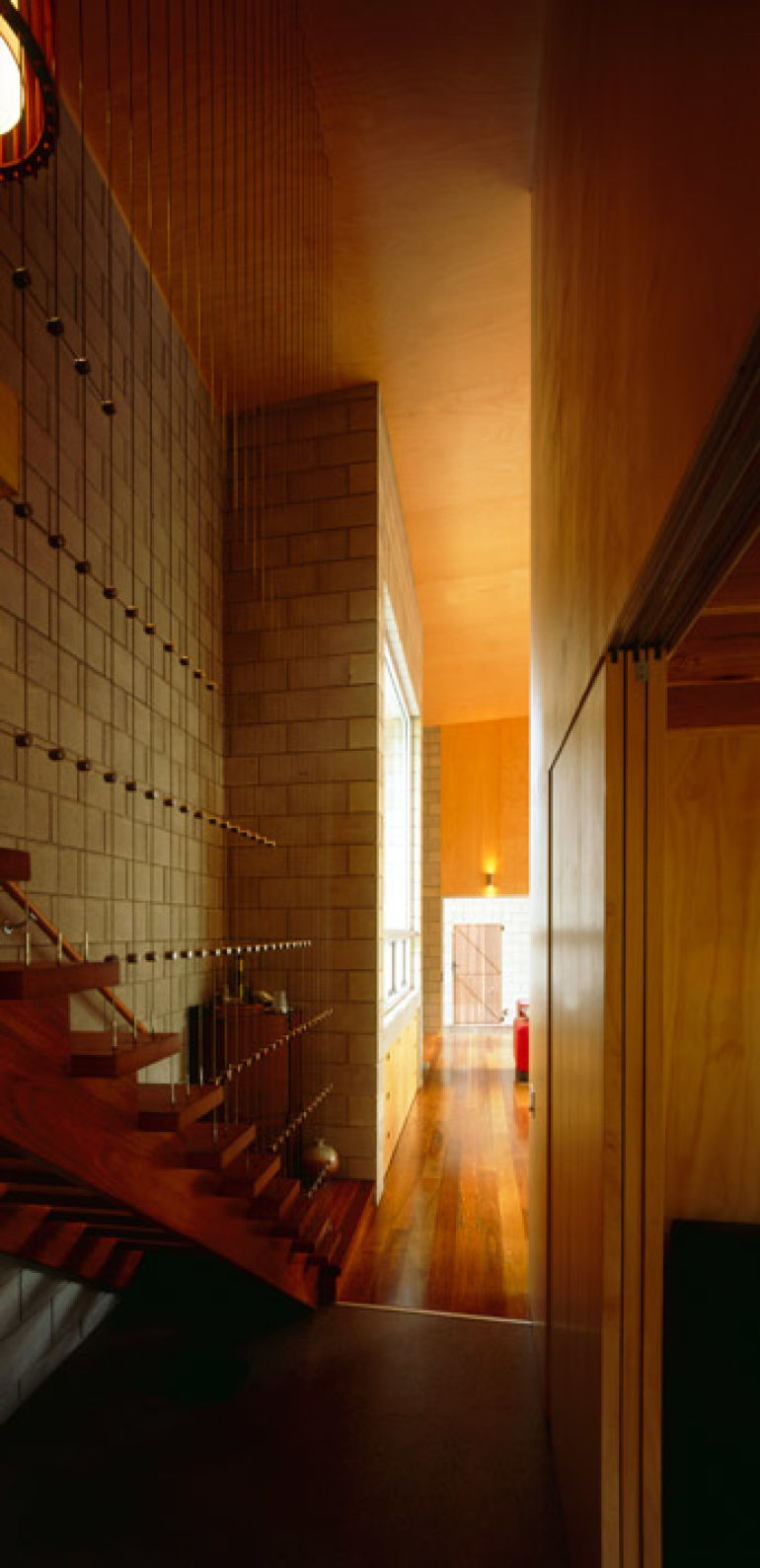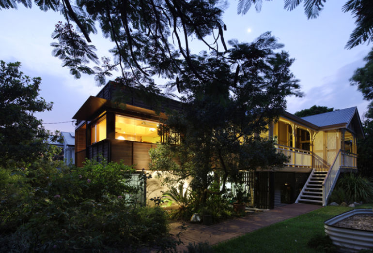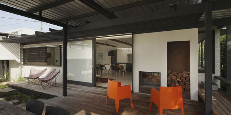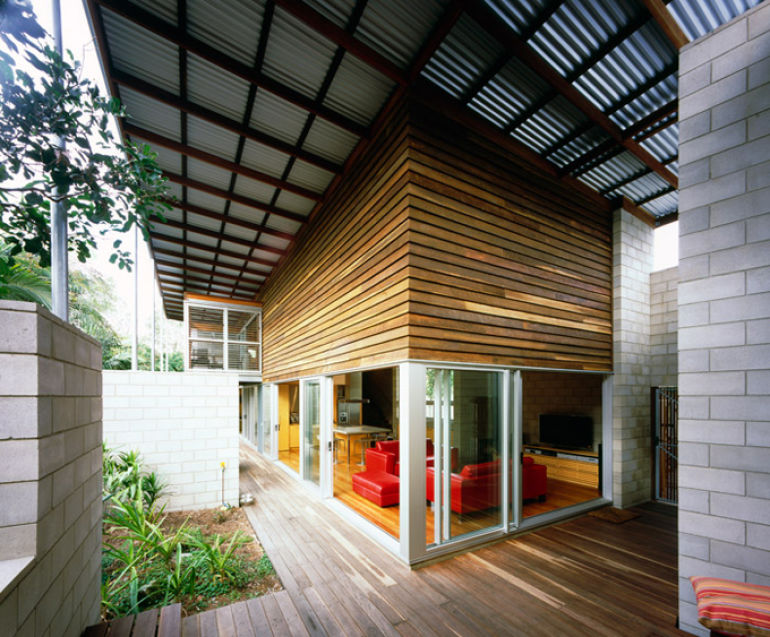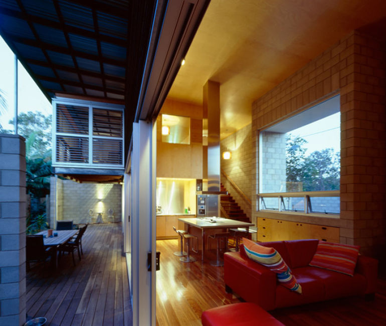 This inovative extention to a traditional Queenslaner creates new bedrooms and living areas for the family. An internal courtyard has been created to ensure a lush and cooling vantage point from all parts of the house. The extension is a contrast to the granduer of the old Queenslander and is more of a simple 'bush-house' (but executed in a very stylish, modern way. Initially old is blended with new in the kitchen, but as the extension cascades down the site, it culminates with the very modern concrete floors, render and steel plate in the bathroom.
